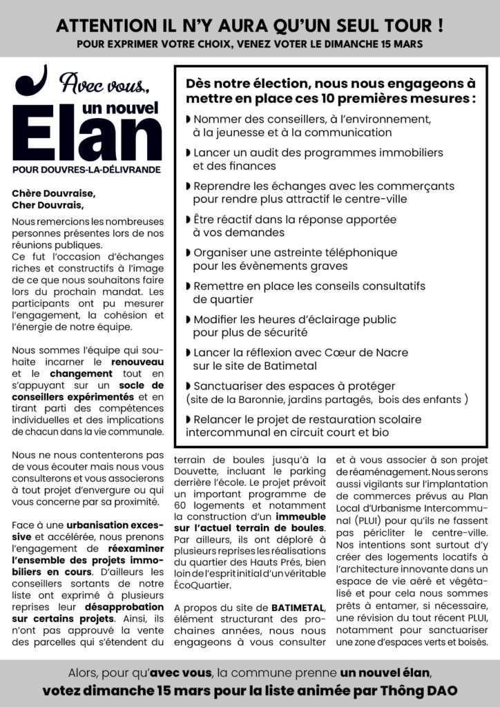 Les membres de l’équipe « Avec vous, un nouvel élan » adressent leurs remerciements aux électeurs qui leur ont fait largement confiance lors du scrutin municipal.